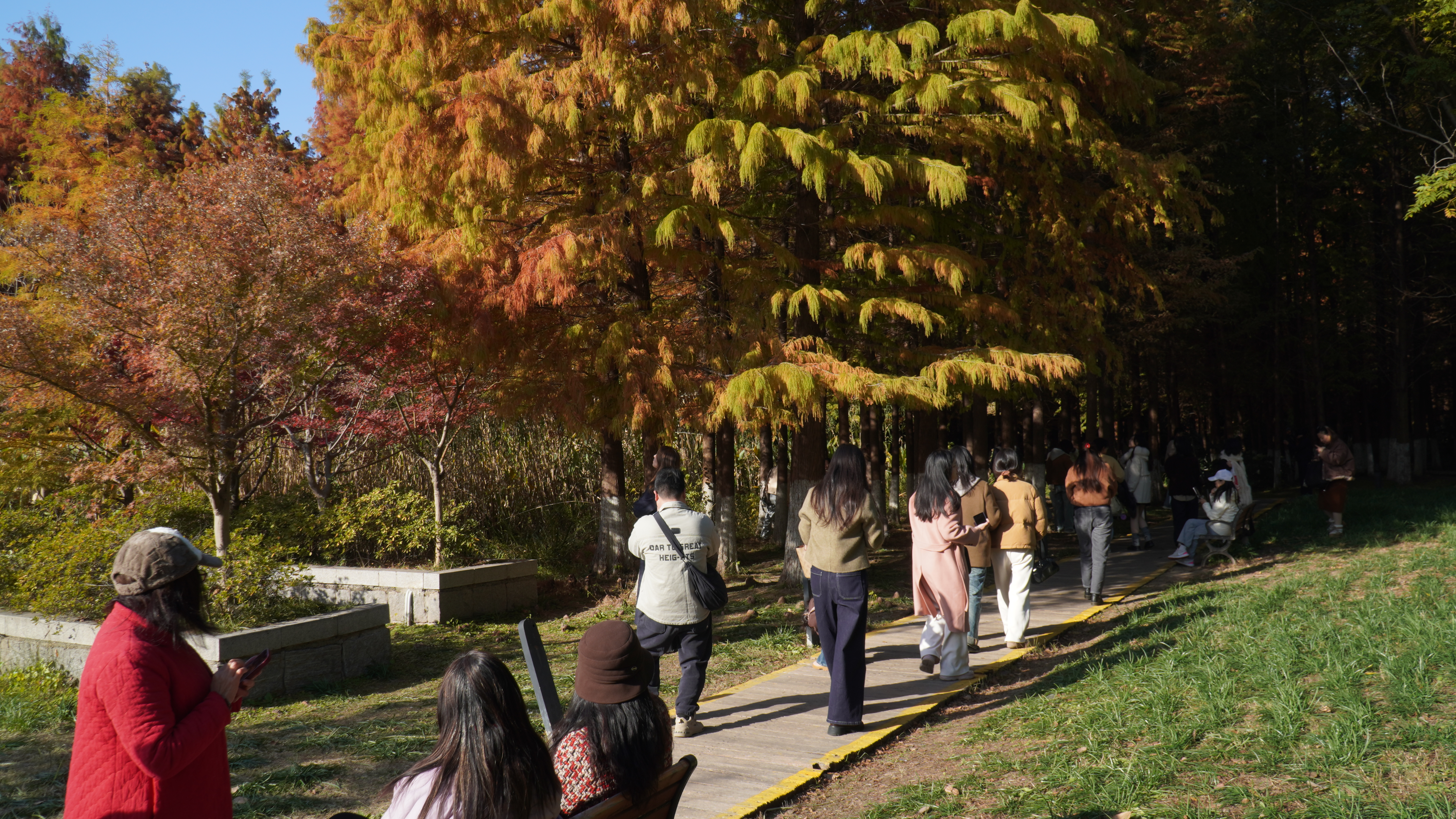 景区相关负责人介绍,目前水杉林即将进入最佳观赏期,为保障游览体验,景区也已加强巡逻引导,提醒游客文明拍照、有序赏景,共同守护这份初冬限定的美好。