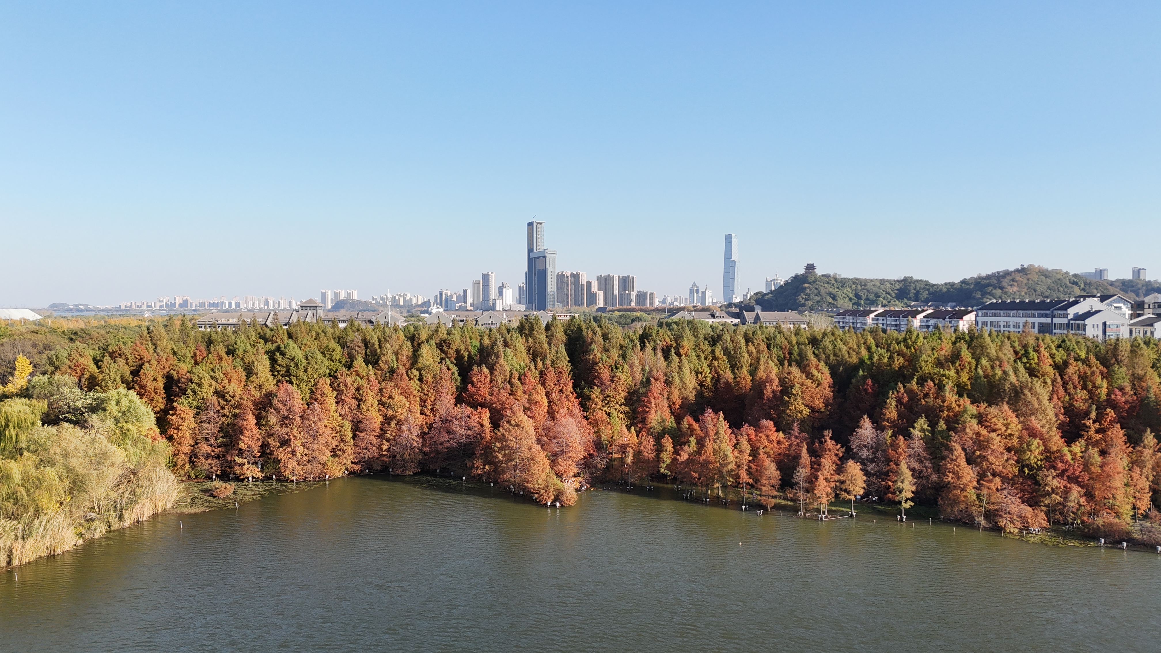 金山湖景区的水杉沿湖而植,树干笔直向上,叶片细密层叠。阳光正好,穿透枝叶间隙,在地面投下斑驳光影,将树叶衬得鲜亮。站在水杉林里环顾四周,水杉与残荷相映,共同勾勒出错落有致的冬日景致。而从高空俯瞰,又是另一番风光:沿湖的水杉受水汽与阳光的影响,叶片已全然变红。离湖越远,水杉越绿,形成绯红、橙黄、浅绿的色彩渐变。