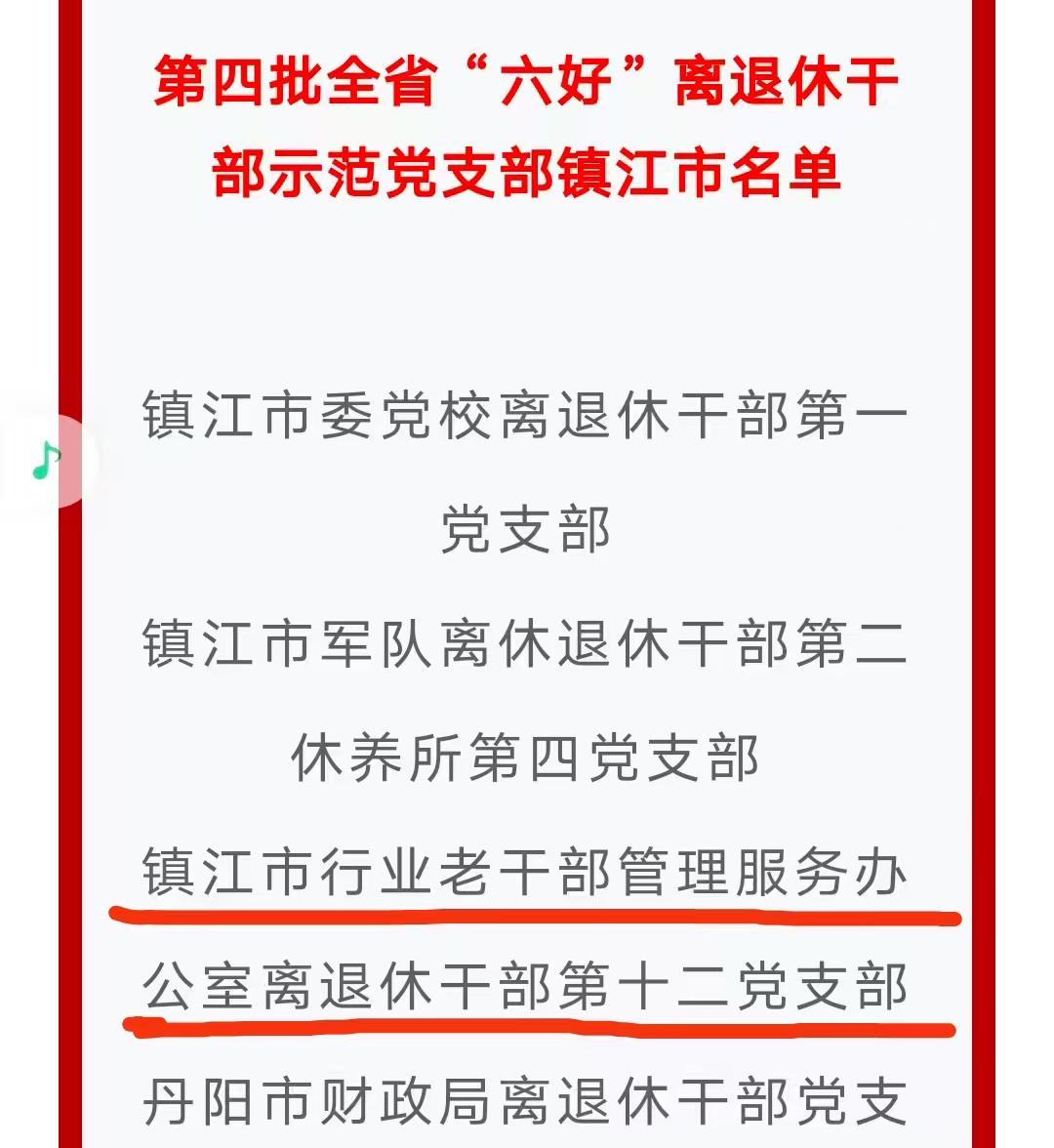 今日镇江讯(通讯员 陈晓春 记者 陈志奎)近日,江苏省第四批“六好”离退休干部示范党支部名单揭晓,镇江市10个离退休干部党支部光荣上榜,其中镇江市国资委行业老干部办离退休干部第十二党支部榜上有名,该支部在其中排名前三。这份沉甸甸的荣誉,既是对第十二党支部老党员们“离岗不离党、退休不褪色”担当的高度认可,更是镇江市国资委行业老干部办离退休干部党建工作硕果累累的生动见证。让我们一起了解他们“从严从细抓‘六好’创建,激发支部工作新动能”的经验做法。