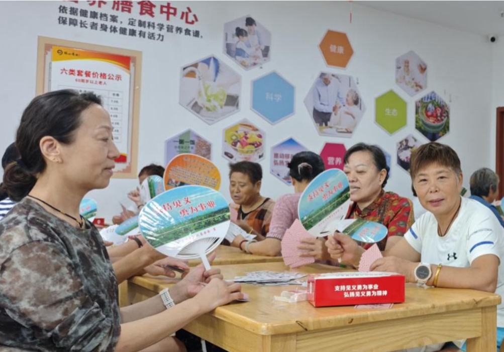活动现场,志愿者们在老年活动中心人员较为集中的区域,向群众逐一发放印有宣传标语的扇子、餐巾纸等宣传用品。定制的宣传扇以醒目的标语传递“弘扬见义勇为精神”的理念,兼具实用性和宣传性。志愿者们在发放过程中,还对群众提出的疑问进行了简要解答,引导大家进一步认识见义勇为的意义。