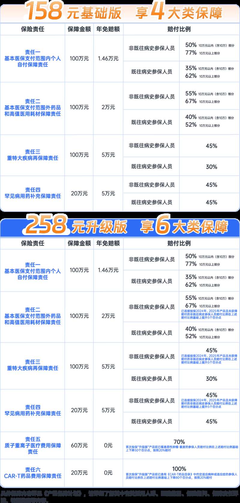 “基础版”保费仍然延续往年的158元/年,解决大病常规治疗花费;258元“升级版”增加质子重离子、CAR-T药品前沿高端疗法,进一步减轻肿瘤患者医疗负担。