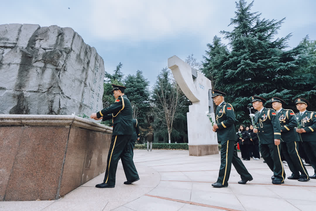 上午9时,陵园内松柏静默,寒风低回。悼念活动在嘹亮的国歌声中正式开始,雄壮有力的旋律划破了冬日寒意,激荡起深植于每个人心中的爱国情怀。全体人员面向纪念碑肃立默哀,缅怀所有惨遭日本侵略者杀戮的死难同胞以及为中国人民抗日战争胜利献出生命的革命先烈。随后,在《国际歌》庄严激昂的旋律中,全体人员怀着肃穆崇敬的心情瞻仰了烈士纪念碑。