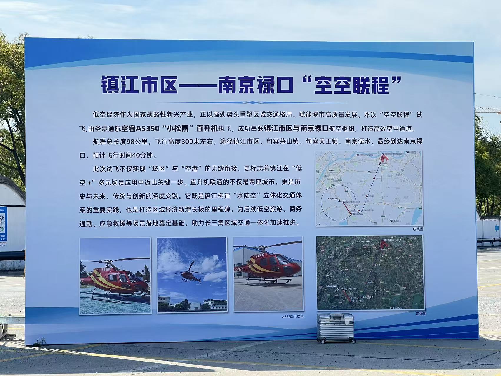 该航线执飞机型为空客AS350(小松鼠)直升机,具备高效、灵活、舒适等特点。航线里程约98公里,飞行高度300米(含)以下,飞行时间仅40分钟,相较地面交通提速不少。飞行途中,乘客还可俯瞰长江壮阔江景、西津渡历史风貌区、镇江“三山”景区等自然与人文景观,沿途串联“江—山—城”多重视觉层次,形成一条融合江河文化与航空体验的“空中文旅长廊”。此次试飞不仅是一次交通探索,更是一次低空视角下的城市形象展示。