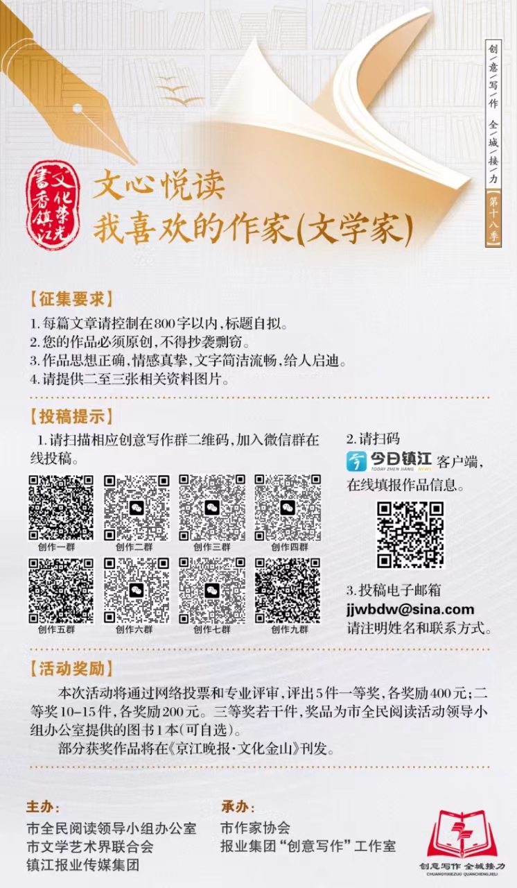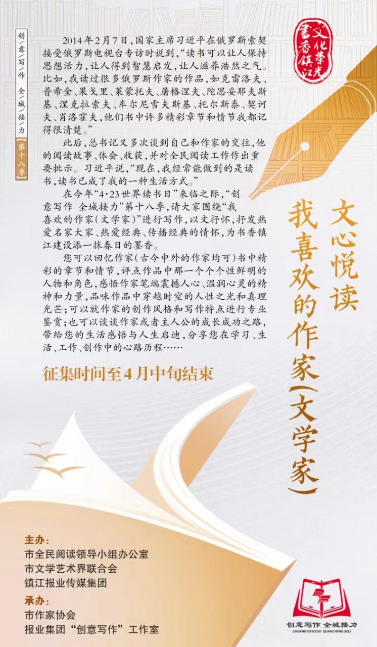 今日镇江讯(全媒体记者 朱晶晶)习近平总书记说:“读书可以让人保持思想活力,让人得到智慧启发,让人滋养浩然之气。”在今年“4·23世界读书日”来临之际,“创意写作全城接力”第十八季,请大家围绕“我喜欢的作家(文学家)”进行写作,以文抒怀,抒发热爱名家大家、热爱经典、传播经典的情怀,为书香镇江建设添一抹春日的墨香。(投稿要求详见文末海报)