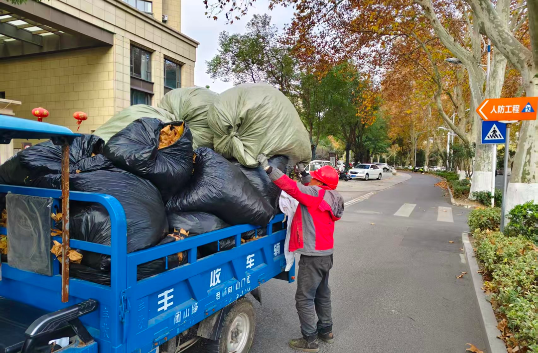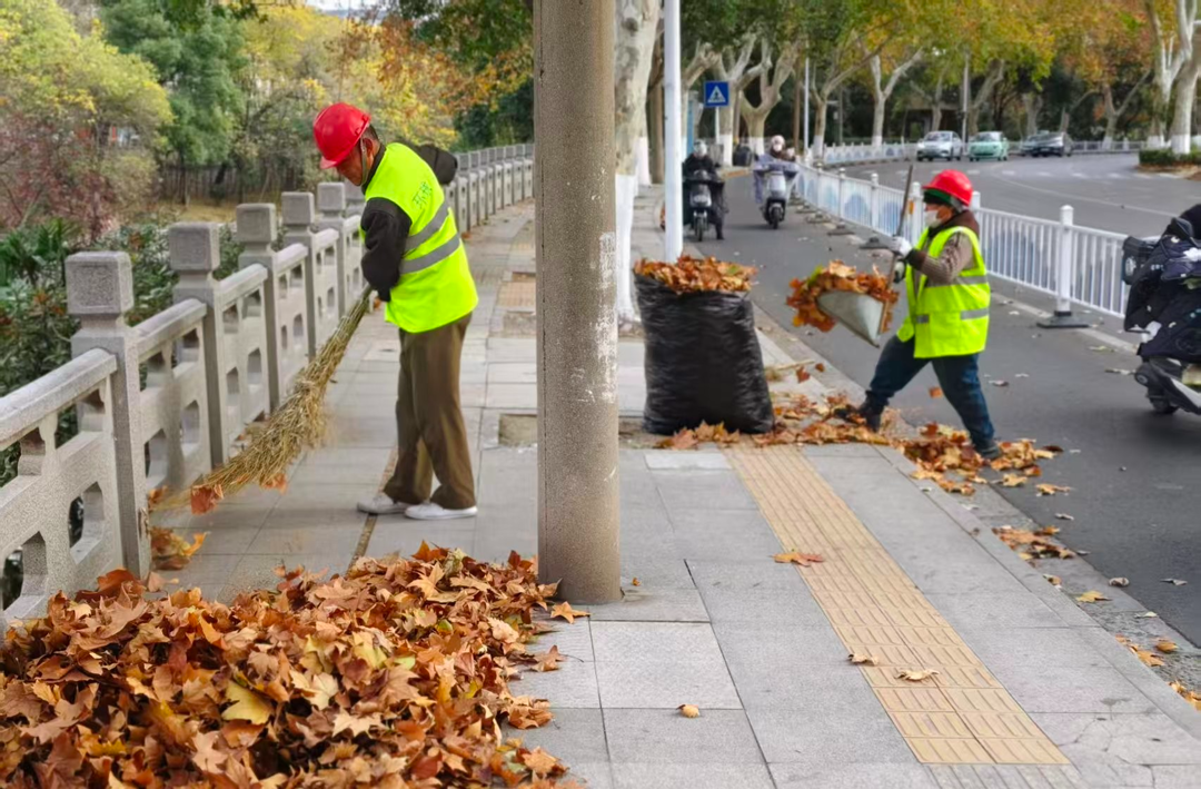 城管部门根据辖区内各路段落叶情况,及时调整保洁人员,增派车辆辅助。运河路、大西路、双井路、东吴路等路段梧桐数量较多,加之绿化带里的枯叶人工清扫不便,环卫人员用各种工具将落叶弄到路边绿化带外侧,再进行统一清扫收集。环卫工人将落叶捆扎入袋,防止因清运不及时而导致落叶“乱跑”。