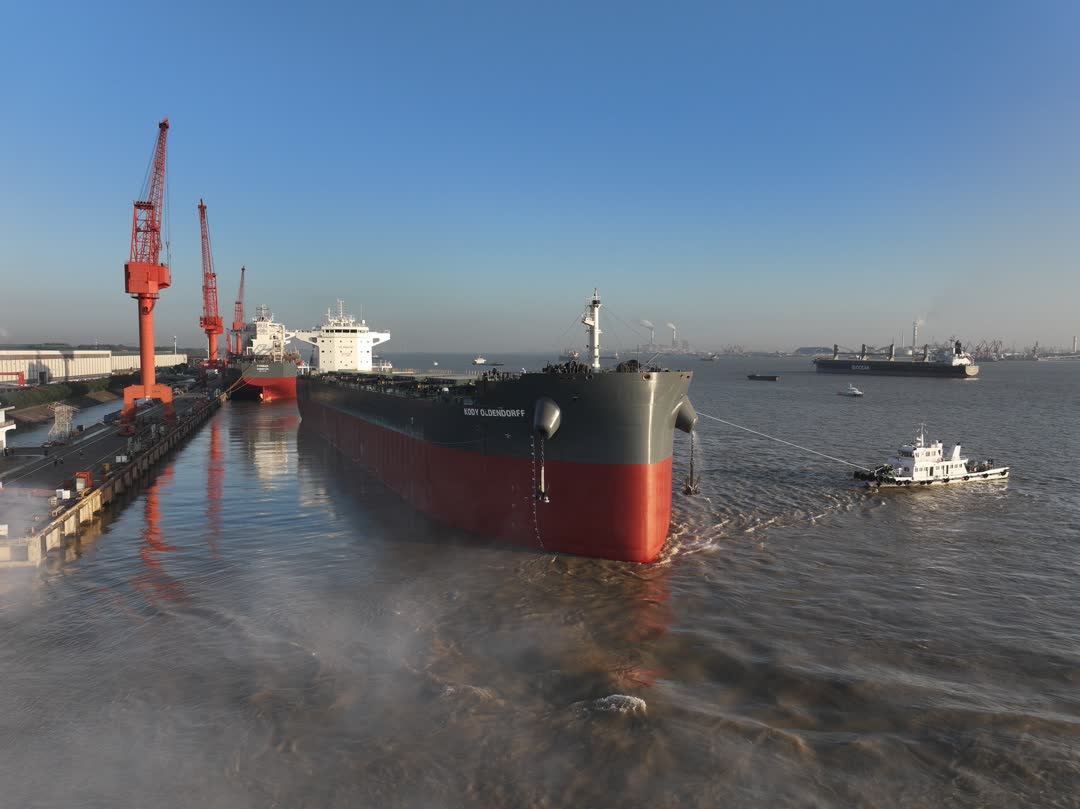 今日镇江讯(记者 陶立波 通讯员 朱汀 孙世权)10月24日上午7时,江苏新韩通船舶重工有限公司船坞内汽笛长鸣,该船企今年第16艘82000载重吨新型散货船在拖轮精准编队牵引、海巡艇全程护航下,平稳离泊,启程出江试航。