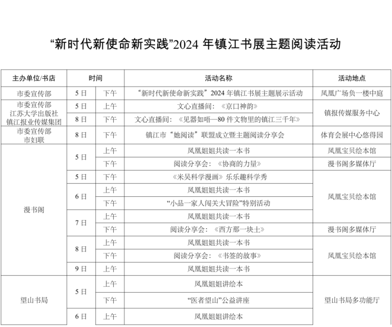 2024年镇江书展期间,各地宣传部门及13家书店将组织“2024年镇江书展主题展示活动”等近150场阅读推广活动,欢迎市民朋友们的参与。