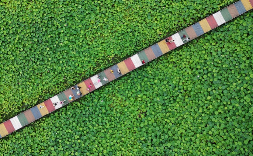 “我今天特意穿了汉服来拍照,光在栈道上就拍了上百张。”来自扬州的游客小徐笑着说,“这里的布景真的太出片了,荷花虽然还没全开,但已经很有感觉了。”