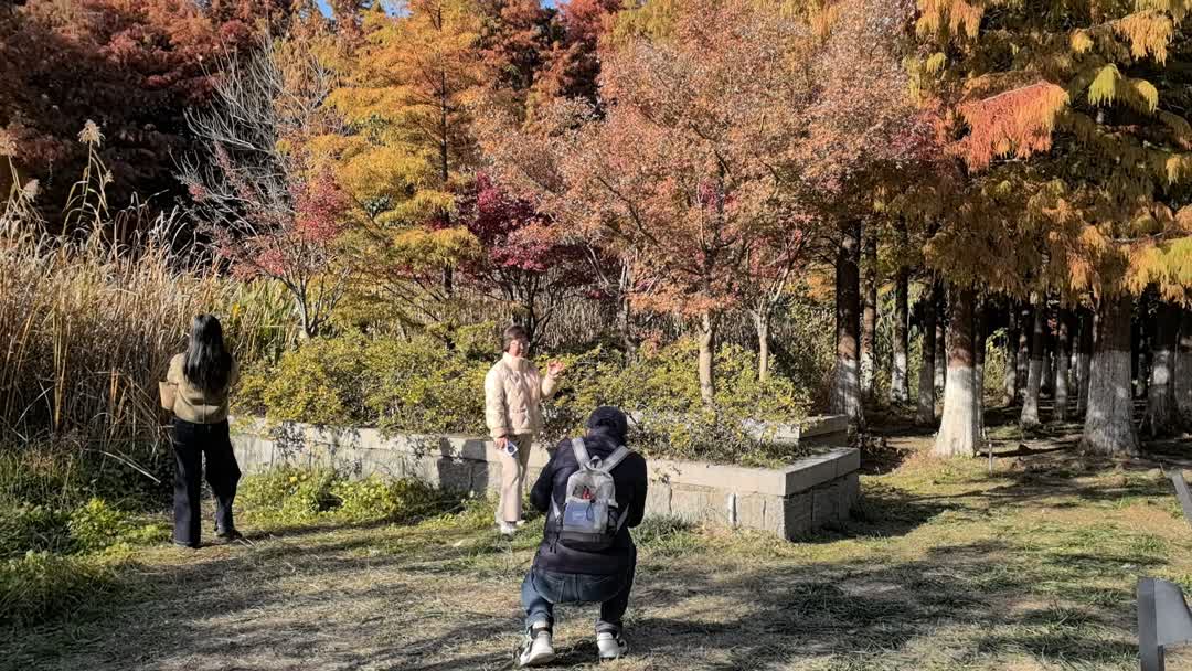 初冬的金山湖景区,成片的落羽杉换上赭红盛装,吸引了不少老年摄影爱好者。“以前上班忙得脚不沾地,摄影爱好只能藏在心里。”趁着取景间隙,李阿姨介绍道,退休后时间充裕,她立刻入手专业摄影设备,圆了多年的摄影梦。不远处,舞蹈机构的老师正在拍摄抖音短视频,李阿姨顺势将灵动舞姿与红杉美景一同纳入取景框内。