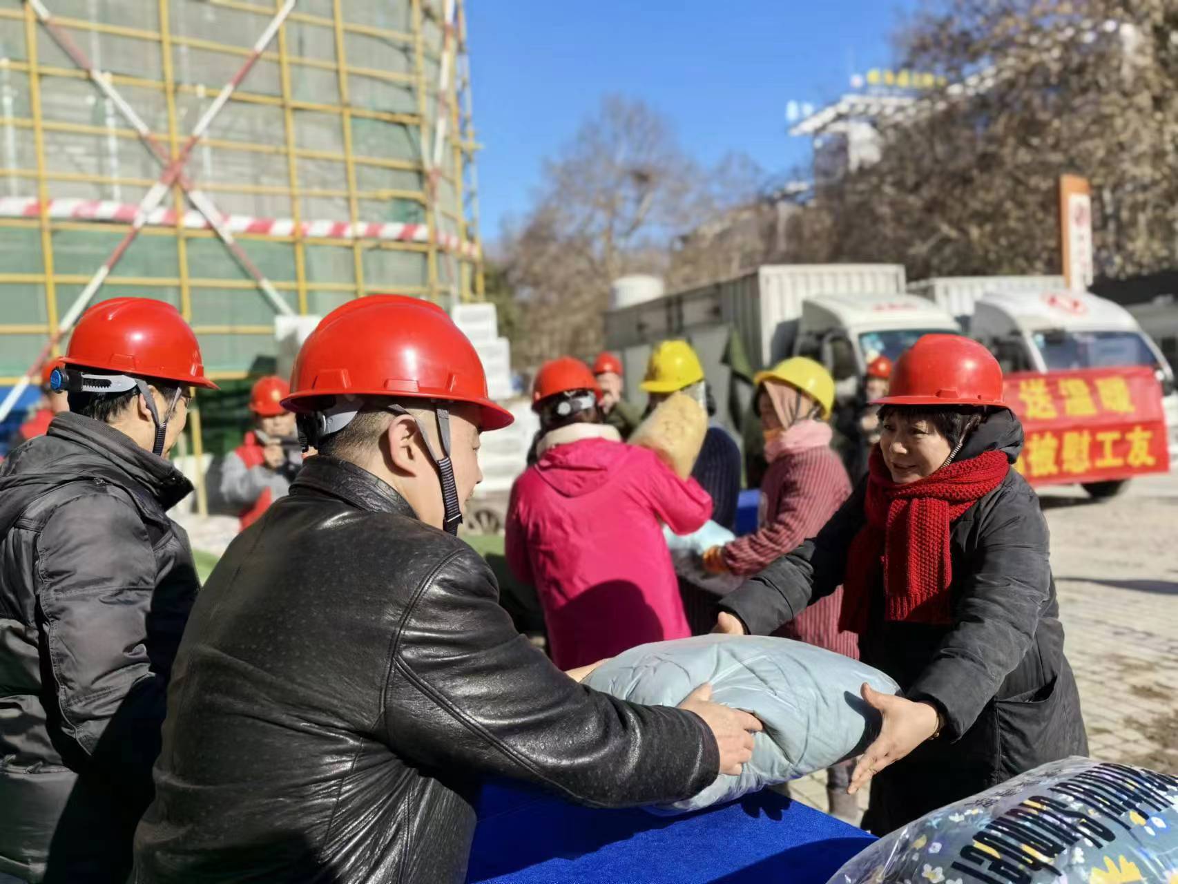 “最近这几天天气特别冷,这些衣物就是及时雨,非常感谢。”捐赠现场,在市工人文化宫修缮提升工程项目工地工作的朱女士拿到了一床被子、两件棉衣,朱女士开心地表示,这些衣物在工地上很实用。