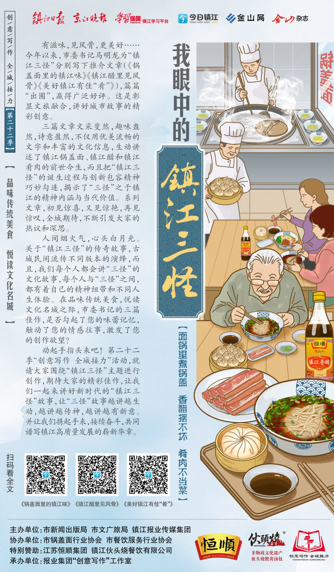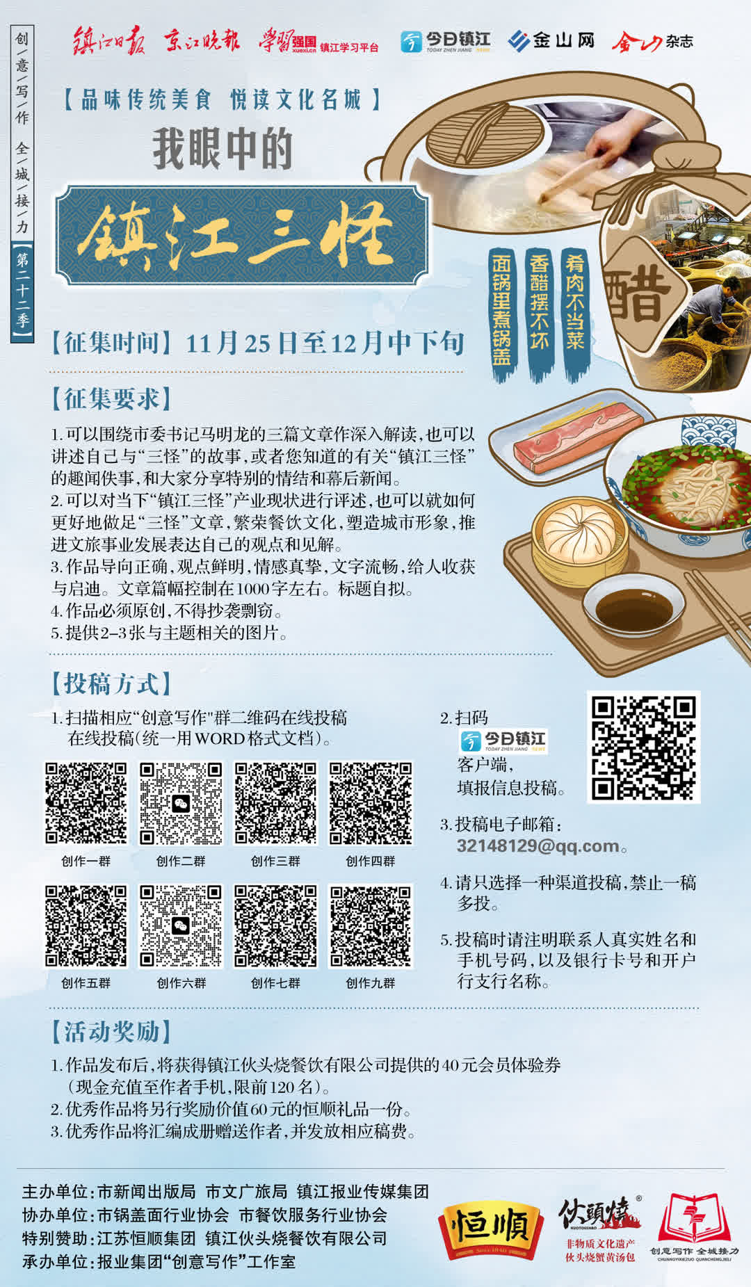 今日镇江讯(全媒体记者 朱晶晶)人间烟火气,心头白月光。市委书记马明龙为镇江三怪写的三篇佳作,是否勾起了您的味蕾记忆,触动了您的情感往事,激发了您的创作欲望?创意写作第二十二季,就让我们围绕“镇江三怪”主题进行创作,让我们一起来讲好新时代的“镇江三怪”故事。(写作要求和提示,详见文末海报)。