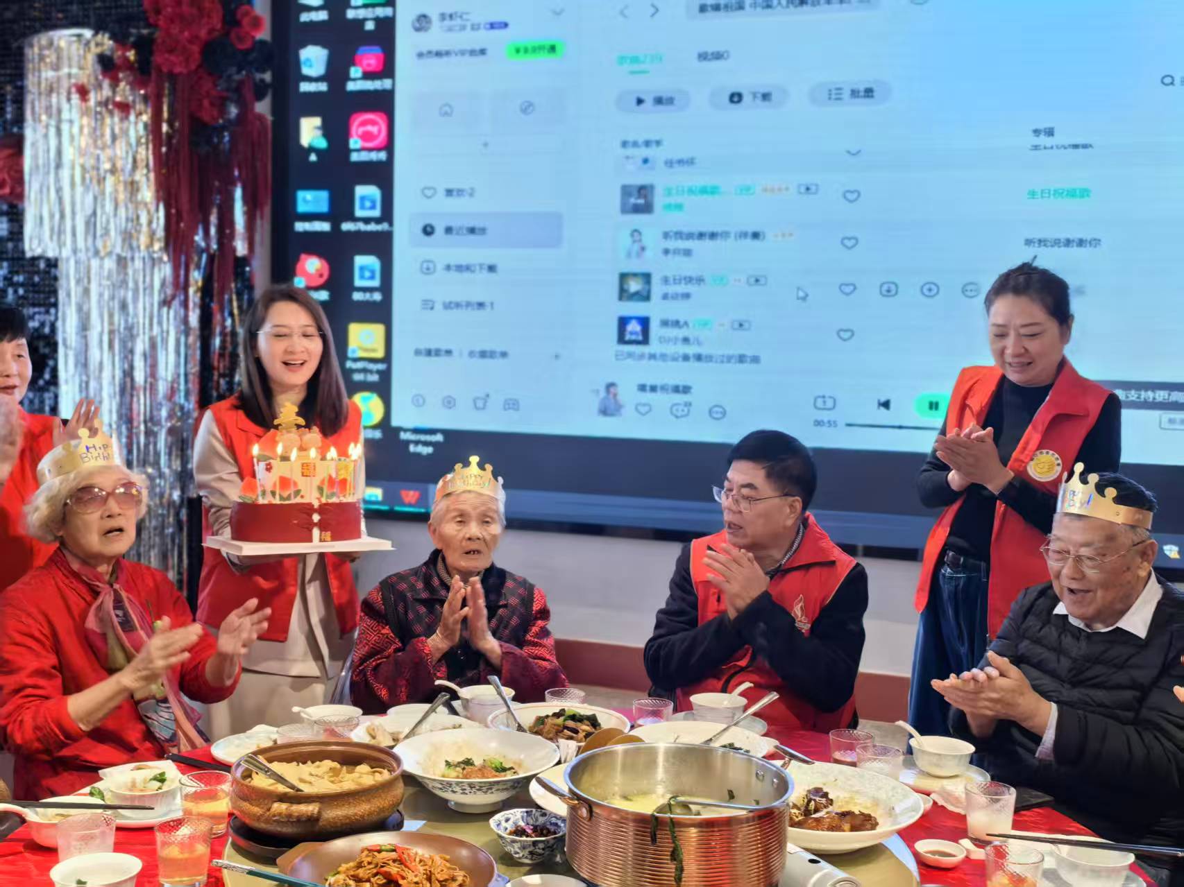 志愿者们为长者送上包含重阳糕、全家福等糕点的定制重阳礼盒,当专属生日蛋糕缓缓呈上时,全场响起温馨的《生日歌》,长者们共庆集体寿辰,“积善之家必有余庆”的祥和场景,生动诠释了“好人有好报”的核心理念。随后,全体人员合唱《歌唱祖国》,嘹亮的歌声将现场氛围推向高潮,合影留念的瞬间定格下这份跨越年龄的深厚情谊。