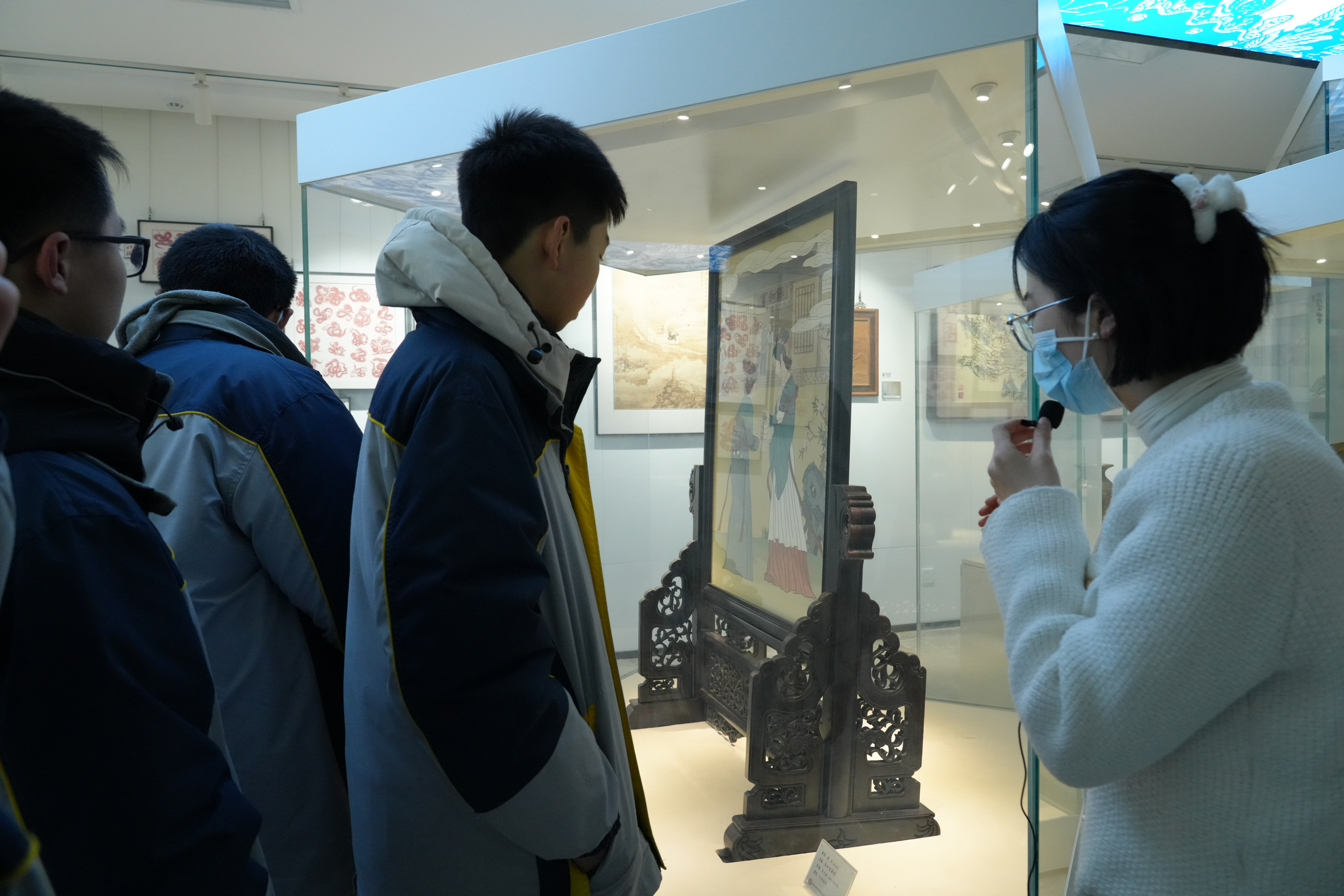 镇江民间文化艺术馆是我国首家以挖掘、收藏、展示和开发地域民间文化为宗旨的公益性全民事业单位。馆内分为多个展厅,陈列的展品不仅代表了镇江地区丰富的民间文化,也反映了中华文化的博大精深。位于一楼的“镇江民间工艺精品展”,展览汇集了乱针绣、太平泥叫叫、烙铁画、刻瓷等60余件艺术精品,展现了镇江深厚的文化底蕴。在二楼“白蛇传传说文化展示厅”,刺绣、绘画、剪纸、邮票、布艺等多种形式的作品,将《白蛇传》的故事情节和人物形象生动地展现出来,同学们欣喜地体验了“白蛇传传说”互动小游戏。“镇江非物质文化遗产”展厅,则集中展示了镇江地区入选国家级、省级和市级的非物质文化遗产项目,同学们直观感受和深入了解了这些非物质文化遗产的历史、工艺、制作流程等。