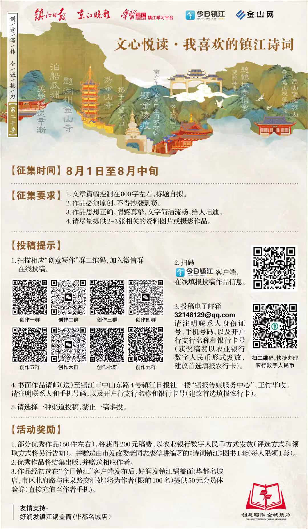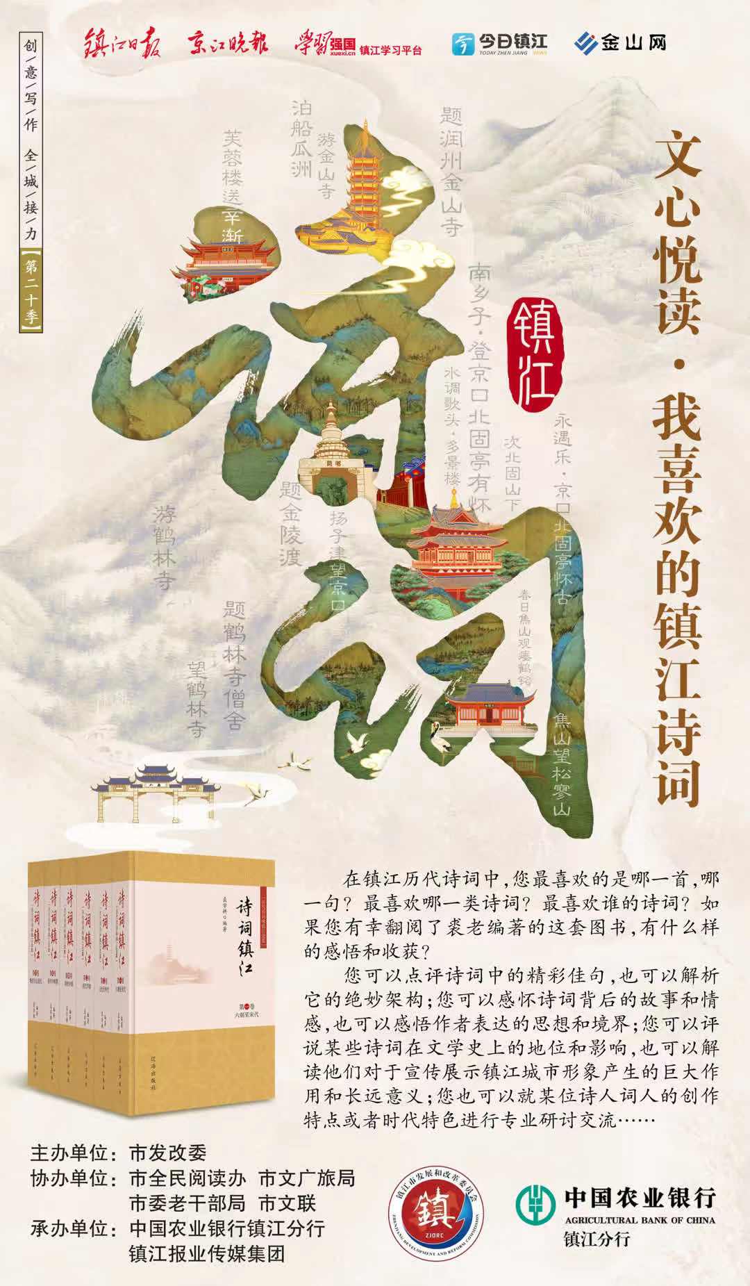 今日镇江讯(全媒体记者 曾海蓉)您最喜欢哪一类诗词?最喜欢谁的诗词?如果您有幸翻阅过市发改委老同志裘学耕编著的《诗词镇江》,有什么样的感悟和收获?“创意写作 全城接力”第二十季,邀您围绕“文心悦读·我喜欢的镇江诗词”主题创作,共吟镇江诗词、品家乡之美。现将部分作品展示如下,以飨读者。(投稿要求,详见文末海报)