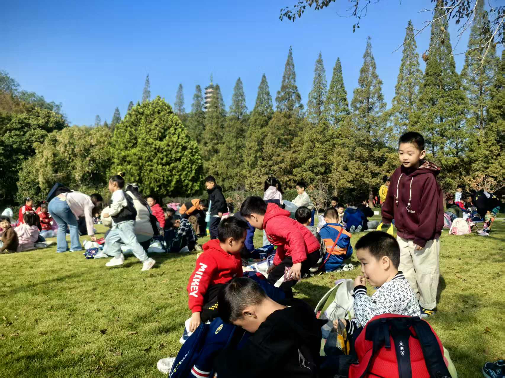 在焦山景区的鹤园草坪上,孩子们正三五成群地席地而坐,或聚在一起分享零食,或专心致志地玩着棋盘游戏。阳光透过树叶洒在他们的身上,空气中弥漫着清新的秋意。老师们不断招呼孩子们前来拍照,记录下这美好的秋日记忆。北固山景区也迎来了红旗小学的500余名学生,孩子们兴奋地穿行在景区的各个角落,与游客们一同欣赏秋天的景色,享受着这份宁静与美丽。