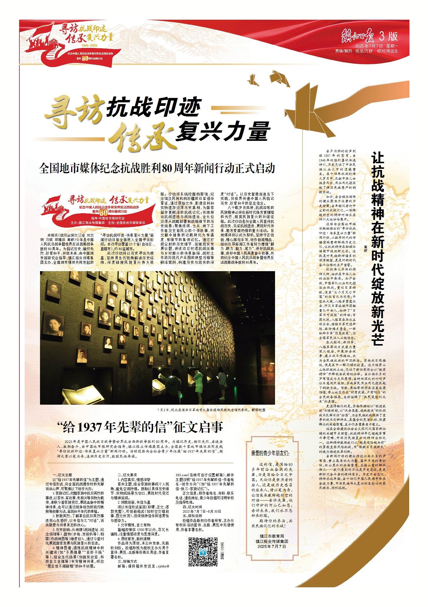 2025年是中国人民抗日战争暨世界反法西斯战争胜利 80 周年。在中国地市报研究会指导下,镇江报业传媒集团牵头主办“寻访抗战印迹 传承复兴力量”新闻行动,联动全国23个省市(自治区)88家媒体共同参与。行动深度融合地方媒体在地优势与全国媒体协同优势,以 “融” 为核心策略,构建“统一策划+在地表达”协同模式,既坚守主题高度,又彰显地方特色。