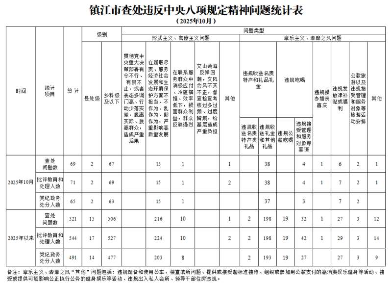 2025年10月,全市共查处违反中央八项规定精神问题69起,批评教育和处理71人,其中给予党纪政务处分65人。从问题类型看,查处形式主义、官僚主义问题17起、批评教育和处理18人,查处享乐主义、奢靡之风问题52起、批评教育和处理53人。从人员级别看,批评教育和处理县处级领导干部2人,乡科级及以下人员69人。