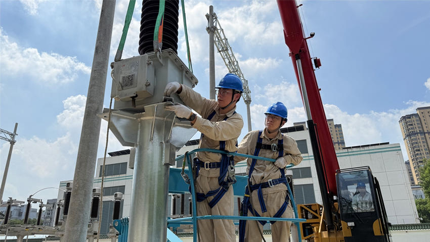 图为句容市供电公司变电检修工作人员周龙麒(左)、夏文彬在进行110千伏电压互感器吊装更换实训。
