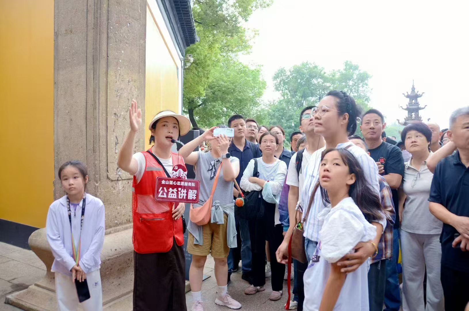 在金山寺、慈寿塔等核心景点,金山莲心志愿服务团队每天推出4场公益讲解;焦山和北固山景区的志愿者也在假期持续提供讲解服务。生动的语言让历史典故和民间传说鲜活起来,吸引不少游客驻足聆听。讲解之余,他们还会提醒游客文明参观、爱护古建,让文化保护的理念在轻声细语中悄然传递。