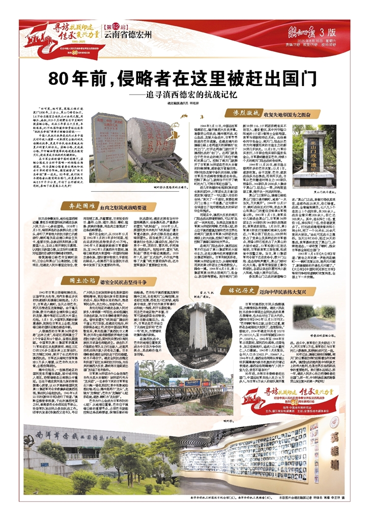 在日军全面封锁中国的困境下,滇缅公路成为当时中国唯一的陆路出海通道。作为滇缅公路重要出境地和抗击日军的前沿阵地,德宏被誉为“抗日生命线”第一边关。80年前,我们把日本侵略者从德宏赶出国门,收复滇西失地8.3万平方公里,开创了全歼顽敌之范例,奏响了收复国土之先声!