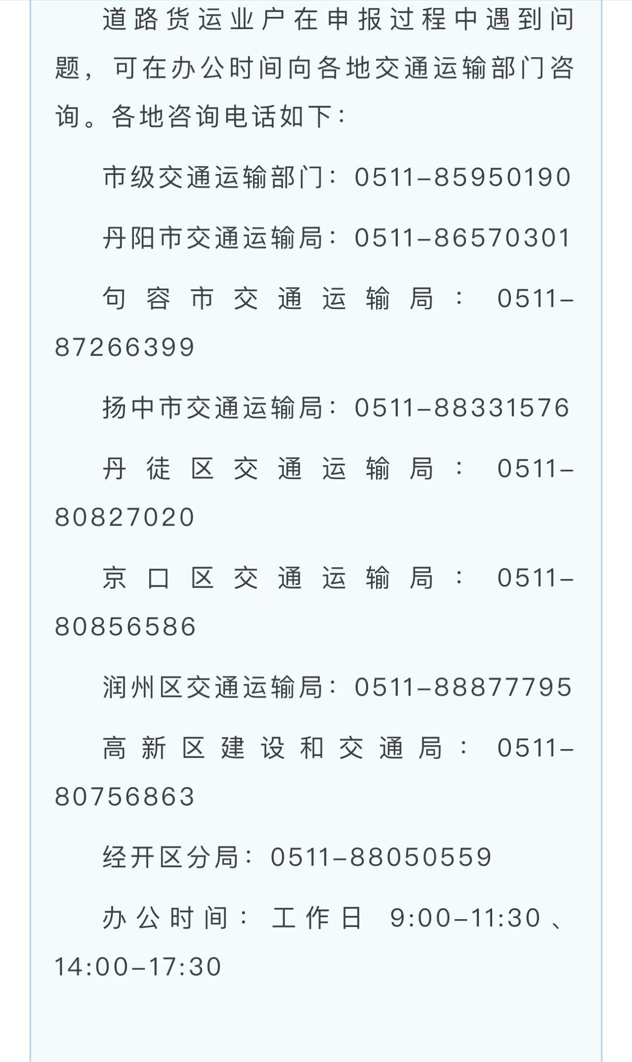 道路货运业户在申报过程中遇到问题,可在工作日 9:00-11:30、14:00-17:30向各地交通运输部门咨询。