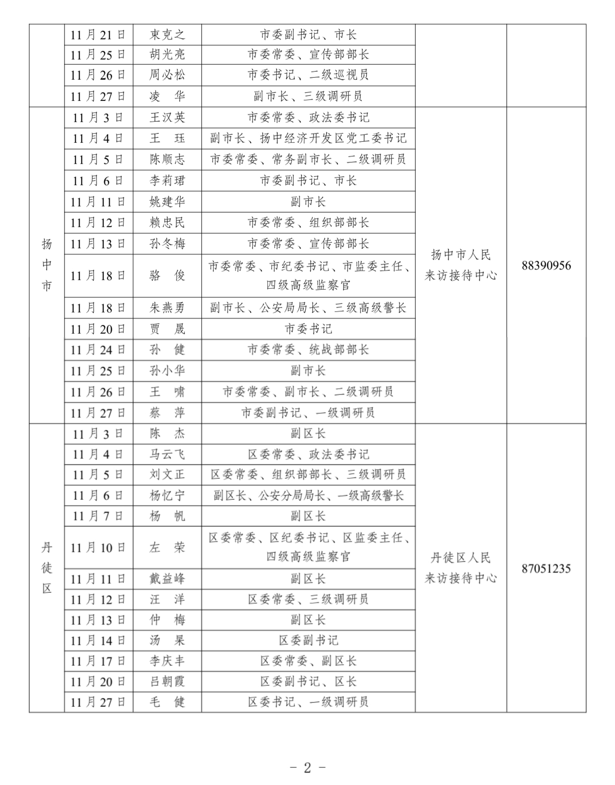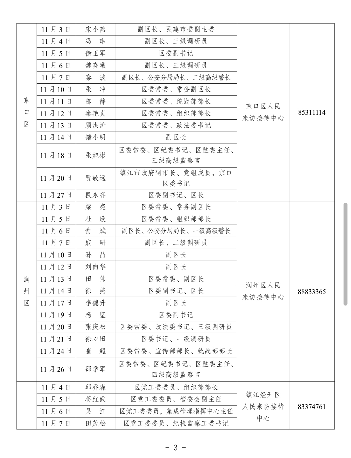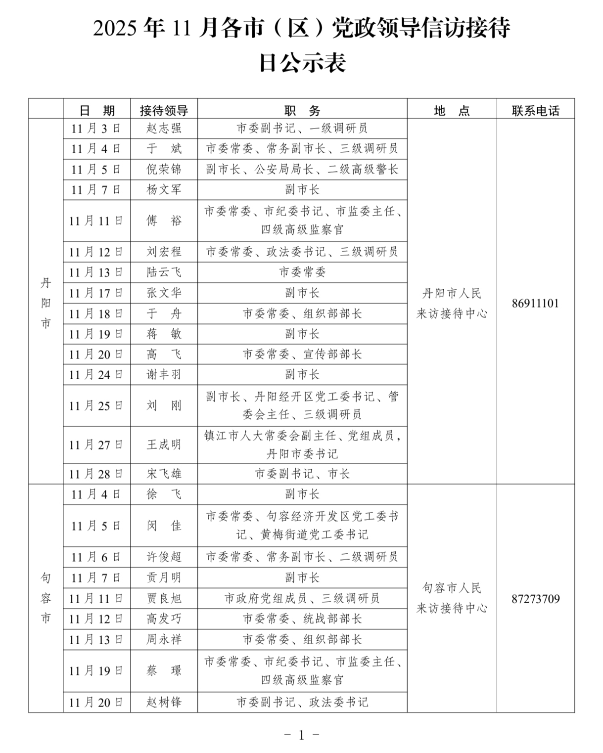 为贯彻落实《信访工作条例》和中办、国办《关于创新群众工作方法解决信访突出问题的意见》要求,现将2025年11月镇江市各市(区)党政领导信访接待日予以公示。